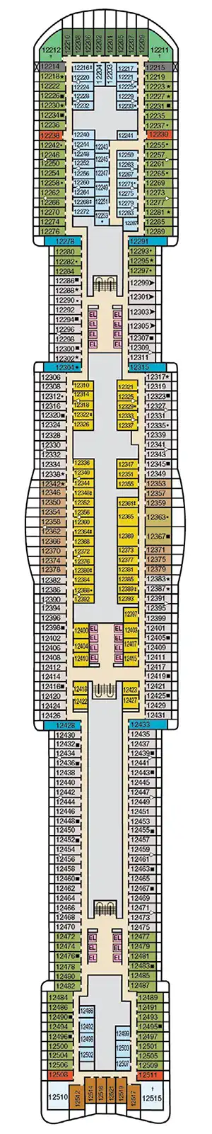 Esta amplia cabina de aproximadamente 19 m² ofrece un ambiente elegante y cómodo para un máximo de 3 o 4 huéspedes. Cuenta con dos camas individuales que pueden convertirse en una gran cama king-size. Según la disposición elegida, se puede incluir un sofá cama individual o un sofá cama individual junto con una litera abatible superior. El baño, moderno y luminoso, dispone de ducha a ras de suelo, lavabo e inodoro. Entre sus comodidades se incluyen televisión de pantalla plana, teléfono, climatización individual, secador de pelo, caja fuerte, minibar, tres amplios armarios, un escritorio y un asiento con puff, perfectos para una estancia relajante en el mar.