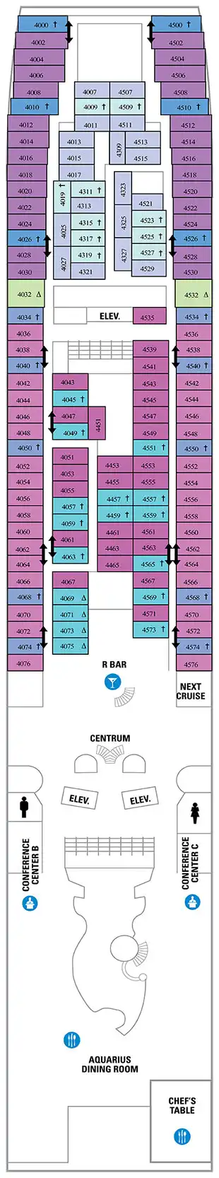 Esta cabina posee Balcón privado, comedor con sofá cama, dos camas individuales o una cama Royal King, sábanas de lujo, TV, teléfono y cajafuerte, baño privado con ducha, área de maquillaje y secador de pelo, servicio en camera disponible las 24 horas.